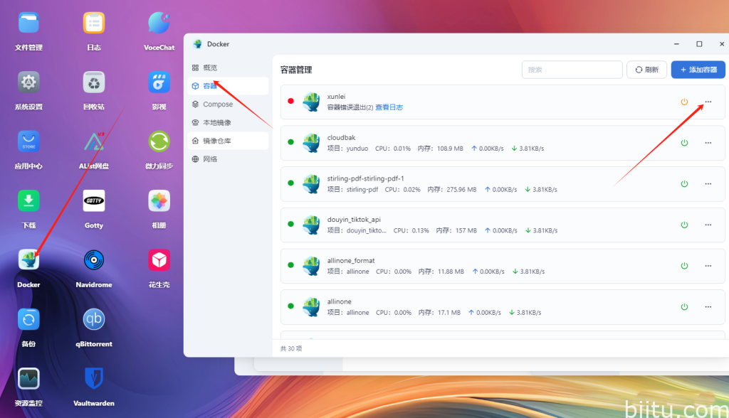 点击飞牛桌面的Docker,然后点容器,能看到一个名字为xunlei的容器,点击右侧的按钮,选择详情。