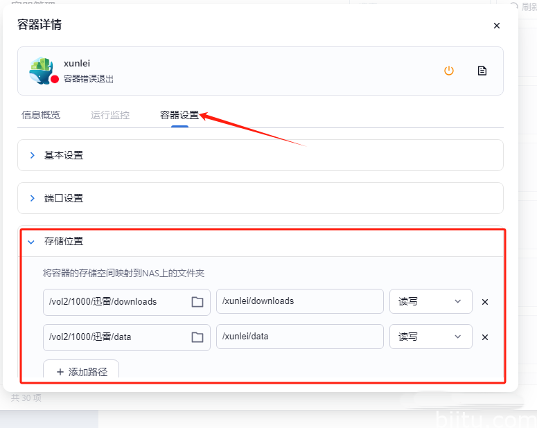 点击容器设置,在存储位置这里,修改默认的两个路径为你刚才创建的两个子文件夹,如上图,然后点击保存即可。
