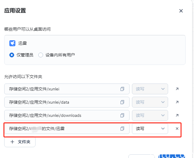 点击+文件夹,把刚创建的迅雷文件夹添加进去,权限为读写,然后确定保存。在应用中心打开迅雷,选择启用。这样就修改了默认的下载路径。